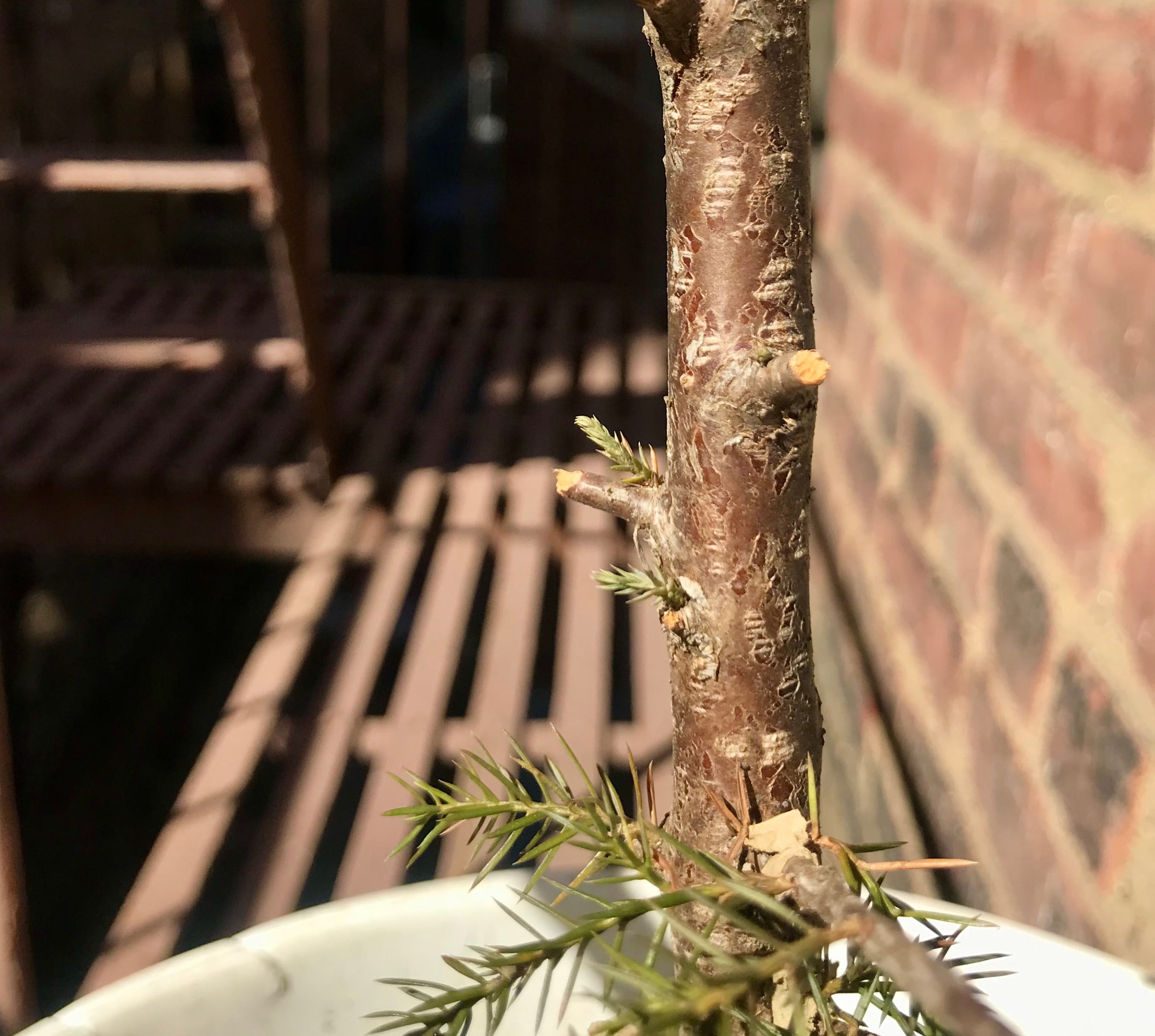 Evergreen conifers like eastern red cedar—which is actually a native juniper, whose fragrant wood is used to make cedar chests—don’t tend to survive complete defoliation. With a deciduous tree whose leaves die off every fall, you can chop a trunk back to a stump and reliably expect new bud growth. Most conifers, on the other hand, need some green to keep the tree alive. So I figured this tree was a goner, but I kept it around just in case.